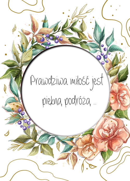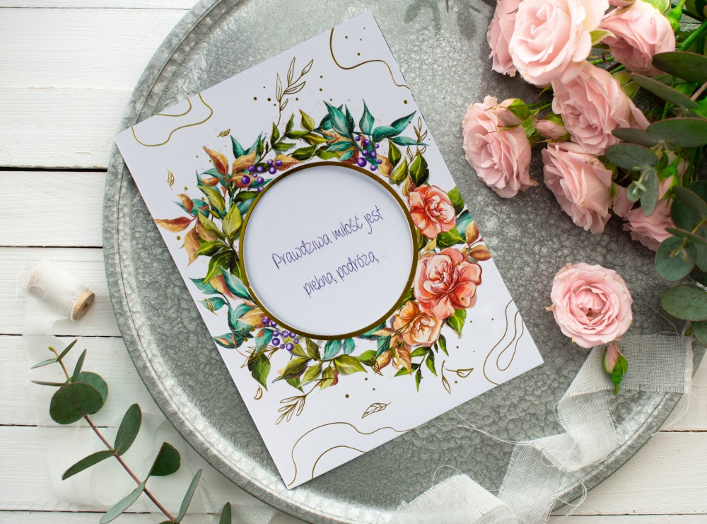 Karnet w formacie B6. Posiada wycięcie i wkładkę z życzeniami. Karnet złocony w zestawie z kopertą.