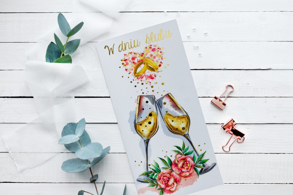 Karnet w formacie DL. Karnet złocony w zestawie z kopertą.