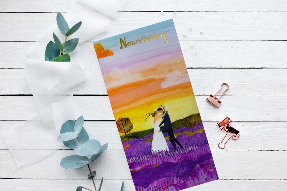 Karnet w formacie DL. Karnet złocony w zestawie z kopertą.