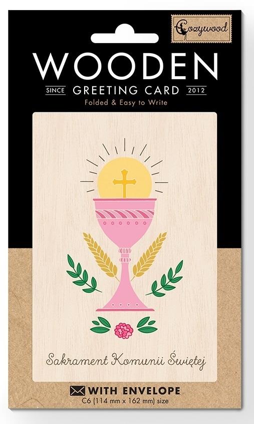 Karnet drewniany C6 Komunia kielich róż + koperta