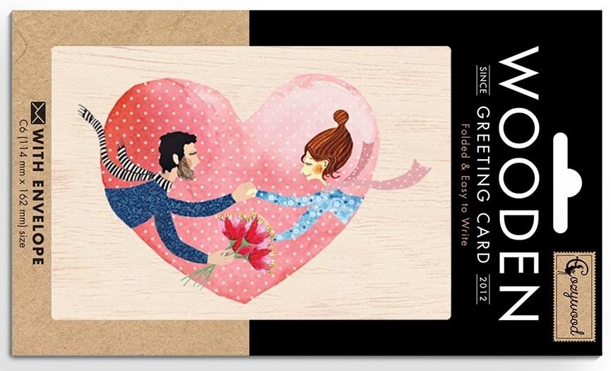 Karnet drewniany C6 + koperta Ślub bukiet i serce
