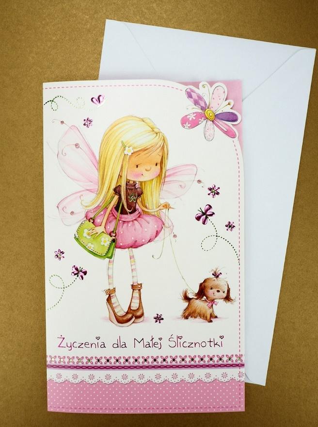 Uroczy karnet z życzeniami i kopertą. Zdobiony dziewczęcym motywem z dodatkiem błyszczącego brokatu. Wewnątrz karnetu kolorowy środek i życzenia.