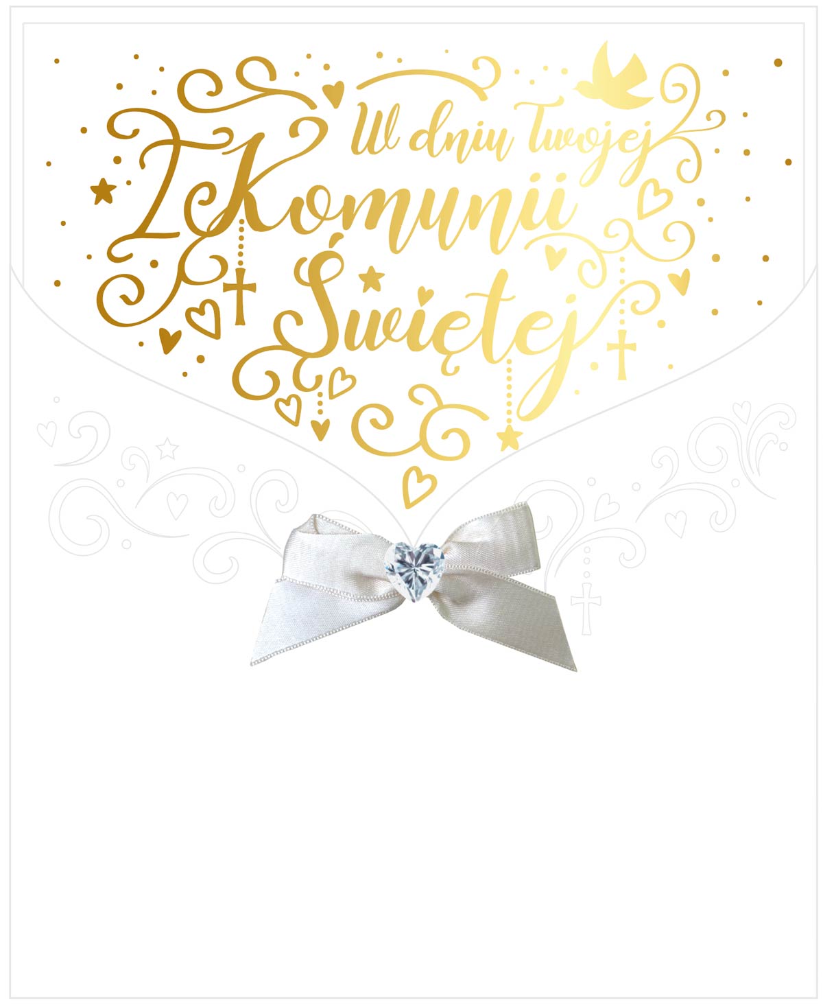 Kartki z serii Primus, to kartki najwyższej jakości, pięknie zdobione m.in złotą lub srebrną folią,tłoczeniami, czy wycinkami laserowymi. Idealne na najważniejsze okazje w życiu, takie jak ślub, komunia. W środku każdej kartki znajdują się dobrane do okazji życzenia, a do kartki dołączona jest dopasowana koperta. Cechy szczególne: wielkość: niestendardowa, prostokątna, kwadratowa, zdobienia: dekoracje ze złotej folii, doklejane koraliki, tłoczenia koperta: dopasowana w komplecie, wnętrze kartki: życzenia w środku, okazja: komunia.