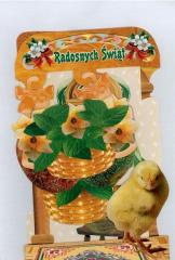 Kartka przestrzenna, o wielkości 12,5 x20,0 cm, dedykowana na święta Wielkanocne. Po lewej stronie znajdują się nadrukowane życzenia, elementy wzoru pokryte zostały lśniącym brokatem.Kartki pakowane są w foliowych woreczkach razem z białą kopertą.