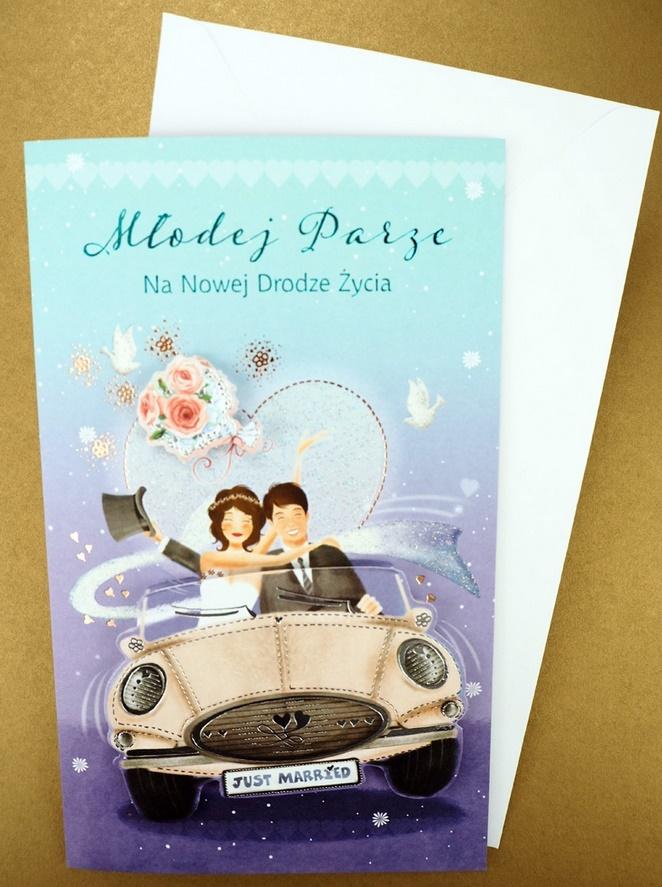 Ślubny karnet z kopertą. Elegancki w subtelnych barwach z efektem 3D . Dodatek błyszczących drobinek nadaje całości elegancji. Wewnątrz ozdobny środek i życzenia.