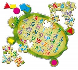 Układając te ogromne puzzle 70x100, dzieci rozwijają zdolności manualne i uczą się alfabetu, pierwszych słów i cyfr od 1 do 5. Ponadto, dzięki wstawkom w łapach sympatycznego żółwia, poznają również kształty i kolory. Puzzle wykonano z materiału "Soft to Touch", dzięki czemu są bardziej trwałe, aksamitne i przyjemne w dotyku.