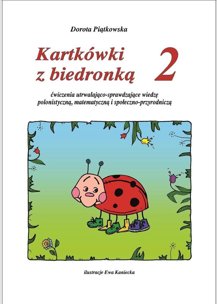 Kartkówki z biedronką 2 to druga z serii książek dla klas 1-3 szkoły podstawowej. Książka została opracowana zgodnie z nową podstawą programową. Zawiera treści z zakresu edukacji polonistycznej, matematycznej i społeczno-przyrodniczej w trzech osobnych rozdziałach. Z uwagi na swoją uniwersalność może być stosowana z dowolnymi programami i podręcznikami jako materiał utrwalająco-sprawdzający wiedzę i umiejętności ucznia zarówno w szkole jak i w domu. Obok wartości edukacyjnej, zadaniem książki jest rozwijanie zainteresowań czytelniczych i szeroko rozumianej twórczości dziecka. Ćwiczenia w niej zawarte mogą być wykorzystywane w profilaktyce ryzyka dysleksji rozwojowej i pracy z dziećmi o specjalnych potrzebach edukacyjnych (SPE). I. Edukacja polonistyczna: alfabet, głoska-litera, samogłoski, spółgłoski, dwuznaki, głoski miękkie, zdania, rodzaje zdań, skróty, czytanie ze zrozumieniem, rzeczownik, czasownik, przymiotnik II. Edukacja matematyczna: orientacja przestrzenna, zbiory, cechy wielkościowe, działania na liczbach w zakresie, 10, 20, 30, obliczenia z niewiadomą, mierzenie pojemności, ważenie, cyfry rzymskie i kalendarz, zegar, mierzenie długości, figury geometryczne, wprowadzenie do ułamków III. edukacja społeczno- przyrodnicza: roślina (kwiat, rozwój, uprawa), owoce i warzywa, witaminy, las, w zbiorniku wodnym, kot i pies, zwierzęta egzotyczne, ptaki, łańcuchy pokarmowe, ochrona przyrody, Ziemia.