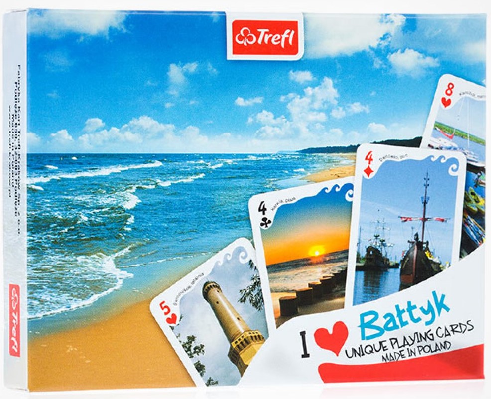 Unikalna kolekcja kart ""Kocham Polskę"" została stworzona z myślą o graczach, którzy lubują się w niebagatelnych wzorach i spersonalizowanych produktach przywołujące na myśl wyjątkowe wspomnienia. Tym razem przygotowaliśmy specjalne wydanie dla tych, którzy kochają zachody słońca nad Bałtykiem. Latarnia morska w Kołobrzegu, piaszczyste plaże Wisełki czy urokliwe kamieniczki w Mielnie - wszystkie te miejsca, piękne i wyjątkowe, uwieczniliśmy w kolekcji kart, którą z przyjemnością Państwu przedstawiamy. Zdjęcia najpiękniejszych miejsc nad Bałtykiem przypominają morską falę, a na rewersie umieściliśmy podwodny świat ryb. Nieważne, czy mieszkamy nad morzem, w górach, czy na Mazowszu - przepiękne pocztówkowe zdjęcia na kartach przywołają wspomnienie lata i umilą każdą rozgrywkę. Karty są doskonałym pomysłem na upominek z wakacji lub oryginalną pamiątkę.