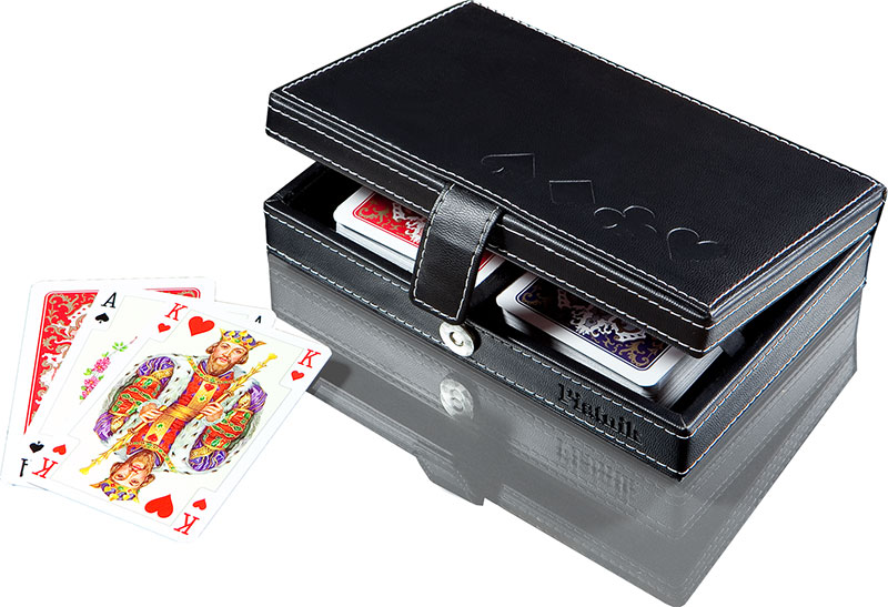 Najwyższej jakości karty Piatnika w eleganckim, czarnym etui z ekoskóry. W komplecie znajduje się również bloczek brydżowy.