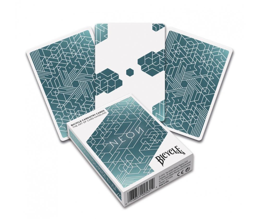 wytłoczony neonowy wzór z przodu i tyłu zakładki, wydrukowano na klasycznym kartonie Bicycle, klasyczne wykończenie Air-Cushion Finish dla łatwego tasowania i optymalnej wydajności. x