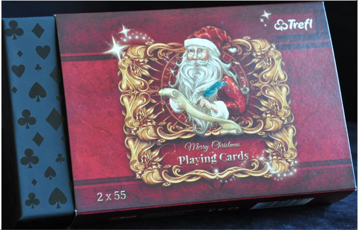 W zestawie 2 talie kart, każda po 55 listków z grafikami utrzymanymi w klimacie Świąt Bożego Narodzenia.