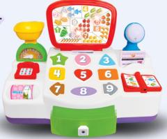 Kasa sklepowa do nauki kolorów, kształtów oraz cyferek połączonej z zabawą sprawi niejednemu maluszkowi wiele radości. Naciskając różne cyferki oraz telefonik, ważąc produkty na wadze, przekładając kartkę mini-książeczki, dziecko usłyszy zabawne dźwięki oraz melodie. Na ekraniku podświetlają się różne obrazki, które uczą dzieci rozpoznawania cyferek oraz liczenia. Zabawka przeznaczona dla dzieci od 18 miesiąca życia
