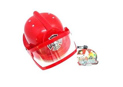 Czerwony kask strażacki z osłoną.