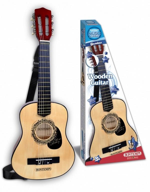Klasyczna drewniana gitara o wysokości 75 cm z możliwością strojenia. Instrument posiada 6 strun. Podczas grania wydaje realistyczne dźwięki.