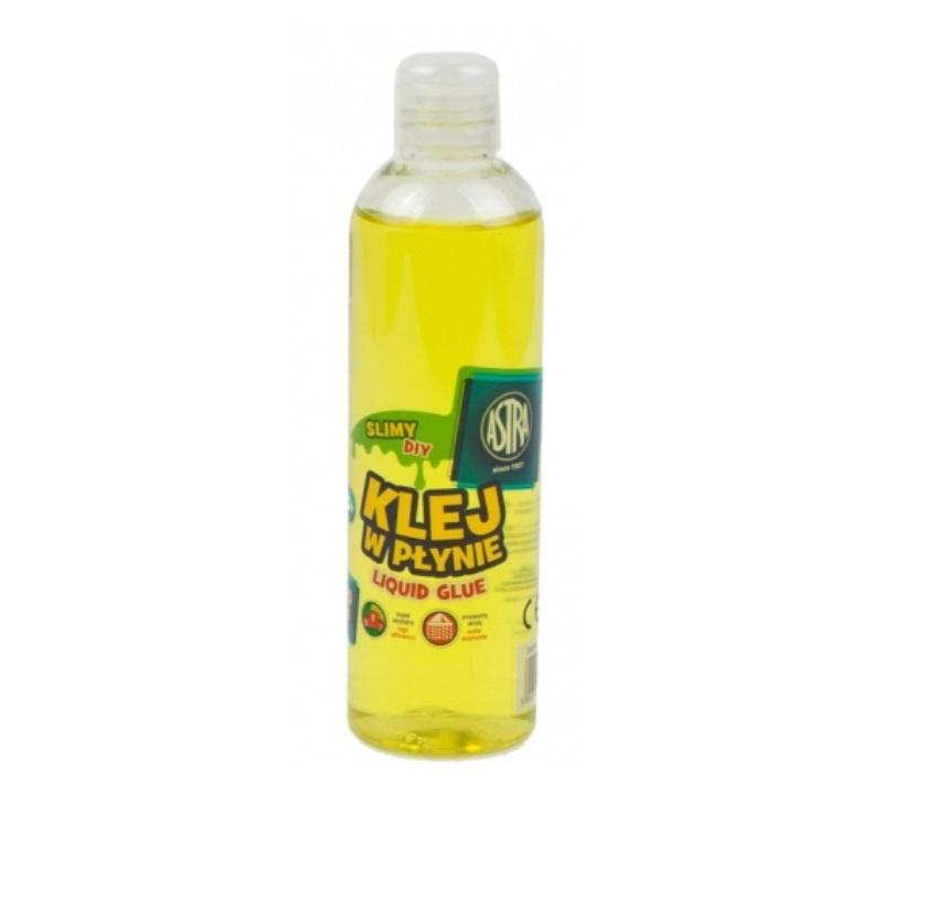 Płynny klej w kolorze żółtym w zakręcanej butelce.