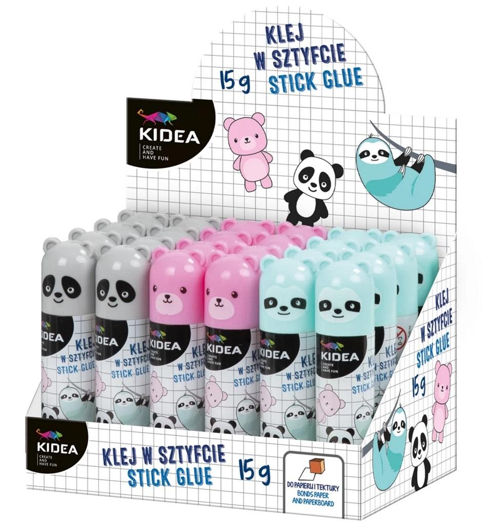 Tradycyjny, szkolny klej w sztyfcie w nowej odsłonie. Urocze zwierzątka na zatyczkach - panda, miś i leniwiec. Klej wysokiej jakości - szybko schnie i mocno trzyma klejone powierzchnie. x