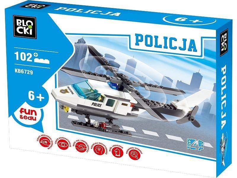 102-elementowy zestaw umożliwia zbudowanie helikoptera policyjnego. Klocki Blocki są kompatybilne z klockami innych firm. Klocki są wykonane z wytrzymałego plastiku w żywych kolorach. Ponadto, klocki zachwycają dużą ilością ruchomych elementów. Twoje dziecko czeka sporo zabawy! x