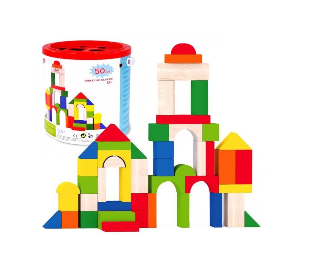 Klocki Drewniane to drewniana zabawka która rozwija sprawne rączki, koordynację wzrokowo-ruchową i wyobraźnię przestrzenną. 50 elementów o różnych kształtach i kolorach. Klocki są przyjemne w dotyku, zachęcają malucha do kreatywnej zabawy. Zestaw jest zapakowany w praktyczne plastikowe wiaderko, które pomoże utrzymać porządek a wygodny uchwyt ułatwi przenoszenie klocków. Zabawka rozwija: inteligencję, kreatywność, zdolności manualne, wyostrza zmysł koncentracji.