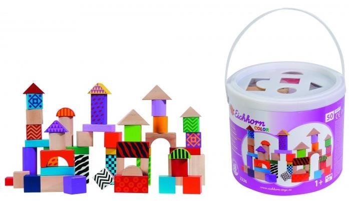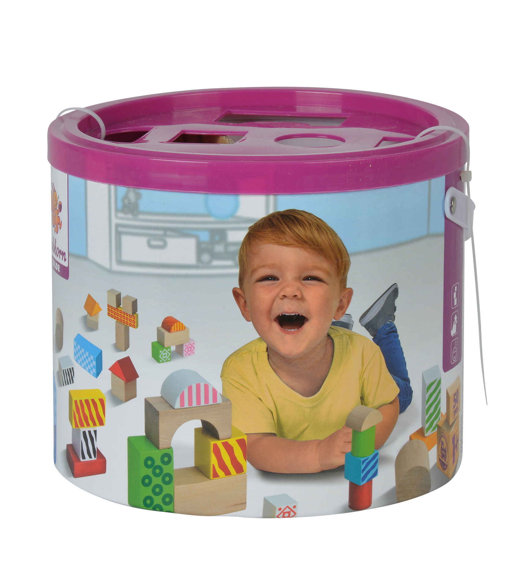 Drewniane, kolorowe klocki w wygodnym wiaderku. Po skończonej zabawie dzieci mogą uporządkować swoje klocki chowając do wiaderka.