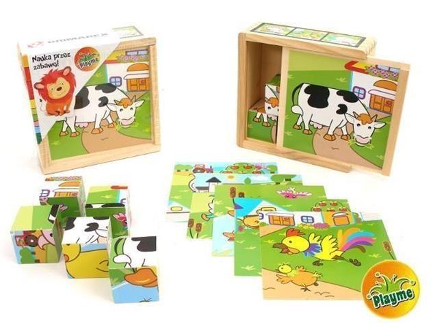 Zestaw drewnianych klocków obrazkowych w pudełku.