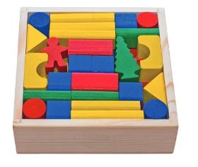 Klocki drewniane, kolorowe, w skrzynce, 50 elementów.