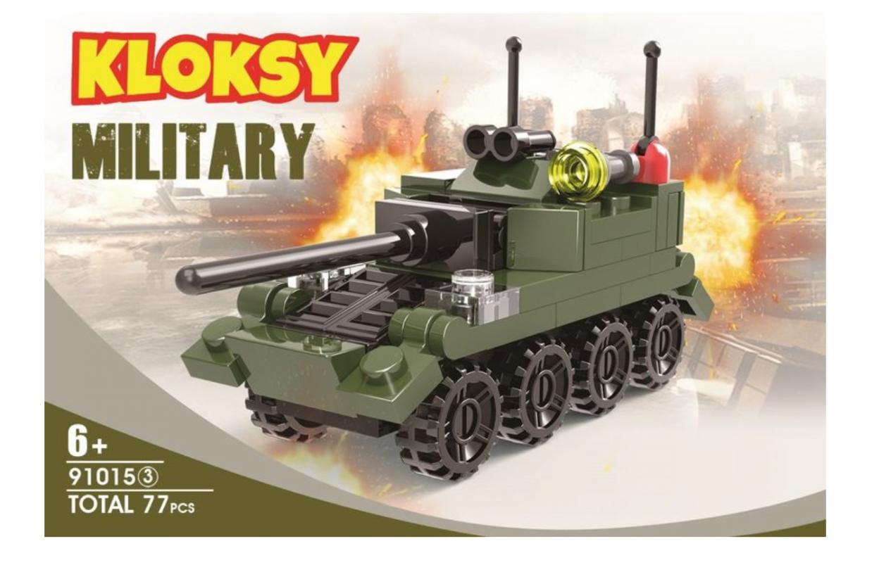 Klocki KLOKSY - seria armia - wóz pancerny, 87 elementów. Zestaw pakowany w display 12 szt. wraz z innymi rodzajami pojazdów wojskowych.