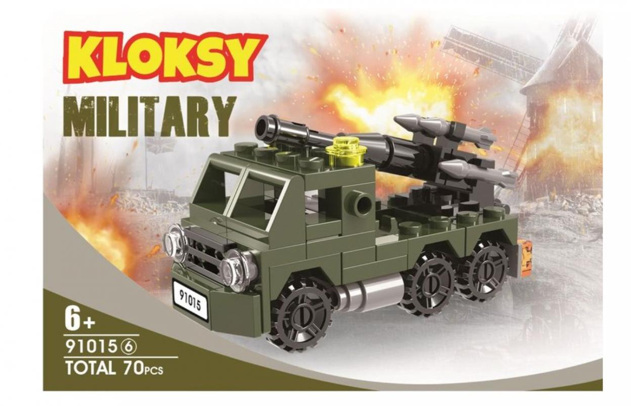 Klocki KLOKSY - Seria armia - wyrzutnia rakiet, 80 elementów. Zestaw pakowany w display 12 szt. wraz z innymi rodzajami pojazdów wojskowych.