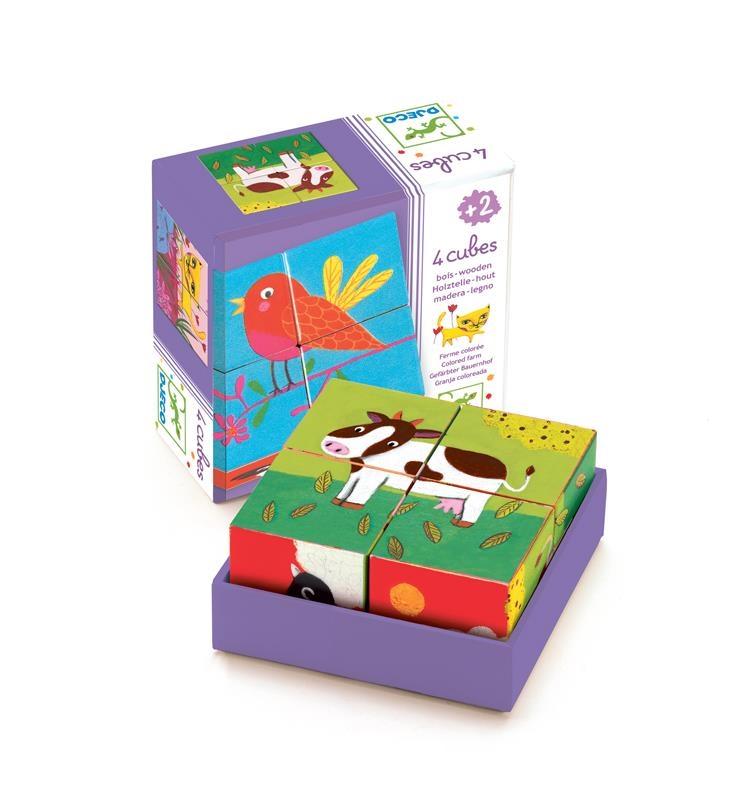 Klocki 4 częściowe Kolorowa Farma firmy Djeco są idealnymi klockami dla najmniejszych dzieci (zalecane dla dzieci od 2 roku życia). Wykonane z drewna z nadrukowanymi, kolorowymi zwierzątkami z farmy zachęcą każde dziecko do zabawy- układania.