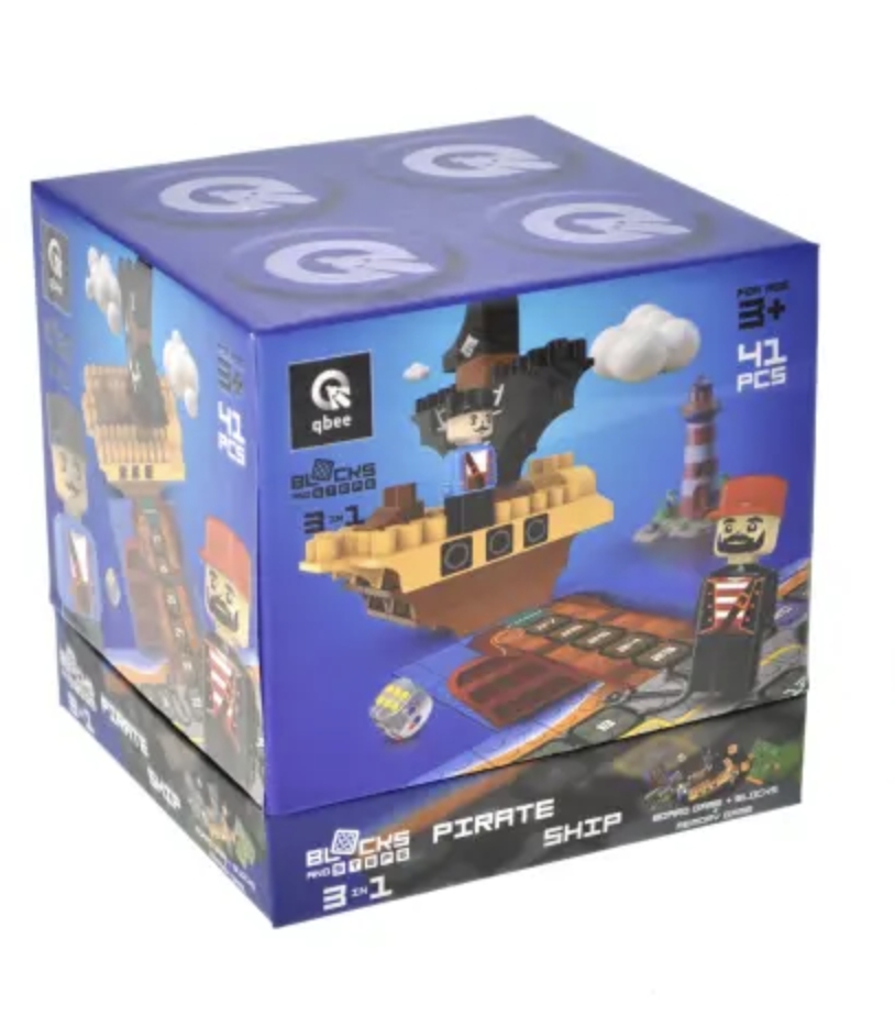 Opis produktuZasady bezpieczeństwaKonstruktor Block&Steps: Piracki Statek + gra planszowa i gra memory 3 w 1, 41 elementów QB300-104 qbee Seria Blocs&Steps od qbee to nie tylko klocki. W każdym zestawie oprócz elementów konstrukcyjnych znajdziesz także tematyczną grę planszową typu chodnik oraz grę memory. Piracki Statek to wielofunkcyjny zestaw dla prawdziwych miłośników pirackich przygód. Zestaw pozwoli dziecku poczuć się jak prawdziwy pirat, stworzyć własną, niepowtarzalną historię i wyruszyć na poszukiwanie skarbów przez siedem mórz. Tematyczna gra planszowa doda zabawie z klockami wyjątkowego klimatu, a wesoła gra memory pozytywnie wpłynie na pamięć dziecka. To idealny wybór dla rozwoju wyobraźni, logicznego myślenia i umiejętności współpracy. Trzy gry w jednym zestawie trzy razy więcej radości! Zestaw przeznaczony dla dzieci od 3. roku życia. Zawartość zestawu: 37 elementów konstrukcyjnych puzzle 1 komplet kostka 1 szt. instrukcja Wymiary: 15 x 15 x 15 cm x