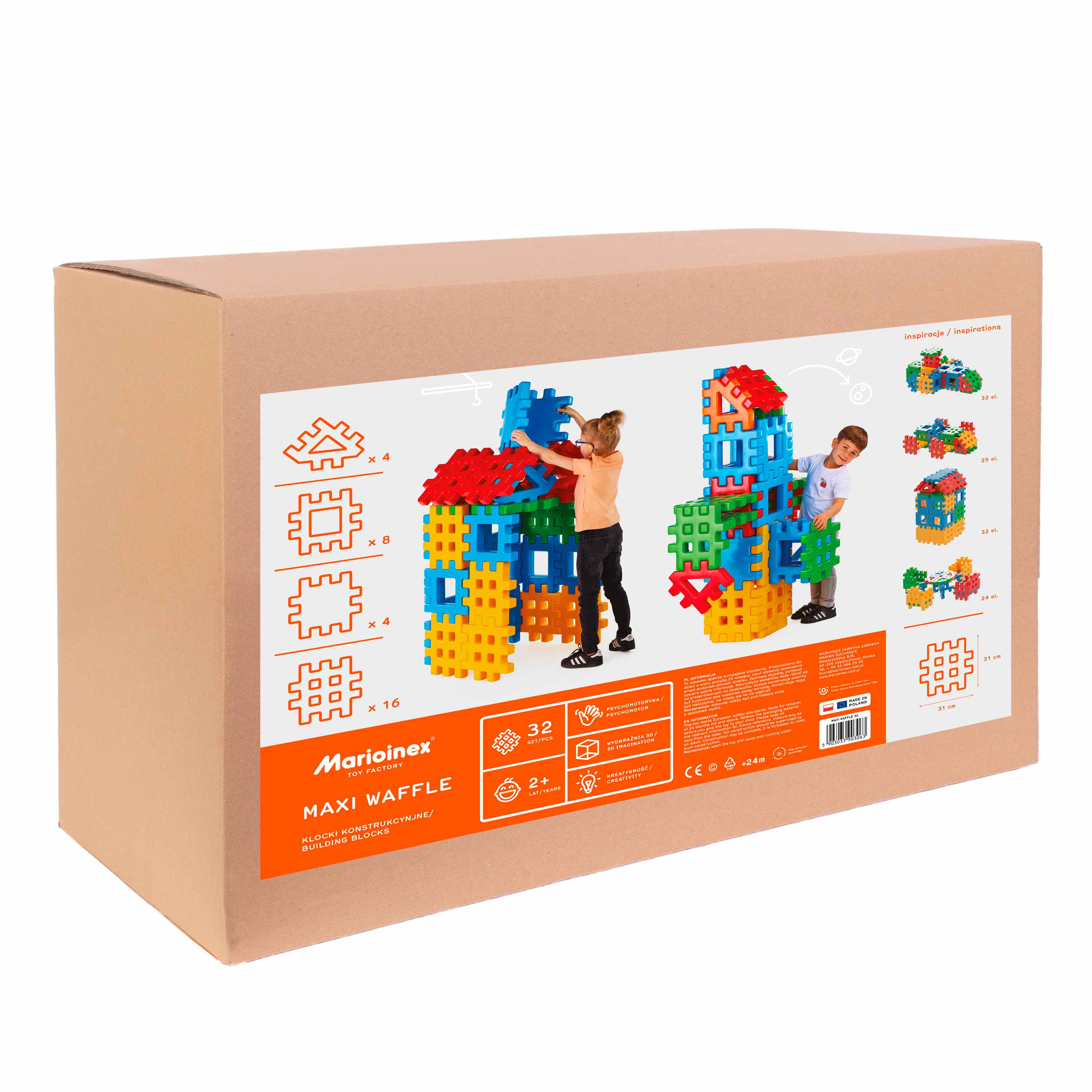Opis produktuZasady bezpieczeństwaMaxi Waffle 32. MAXI WAFFLE to maksymalnie radosna zabawa w budowanie! Gigantyczne klocki dają dzieciom możliwość zdobywania niezwykle cennych doświadczeń. Proces konstruowania nie tylko jest atrakcyjną formą spędzania wolnego czasu, ale również uczy i pomaga się lepiej rozwijać. Mali konstruktorzy z zapałem budują domki i kryjówki, a także skrzynie na skarby i niemal rzeczywistych rozmiarów mebelki. Zestaw nadaje się do wykorzystania zarówno w otwartych, jak i zamkniętych przestrzeniach. Składa się z 4 podstawowych kolorów i 32 elementów. Rozwija dziecięcą wyobraźnię, zdolności manualne i uczy logicznego myślenia. Seria MAXI to największa odmiana klocków Marioinex Waffle o wymiarach aż 31,531,5 cm i grubości 4,5 cm. Dzięki specjalnie zaprojektowanej formie łączą się ze sobą na różne sposoby dając nieograniczone możliwości konstrukcyjne. Marioinex bezpieczne zabawki dla dzieci Zabawki edukacyjne Marioinex są zaprojektowane tak, aby były jak najbardziej przyjazne i bezpieczne dla dzieci. Są wykonane z elastycznego, miękkiego i przyjemnego w dotyku materiału. Posiadają wszelkie atesty bezpieczeństwa, a zastosowane barwy są łagodne i przyjemne dla oka. Produkty MARIOINEX uzyskały nagrody w takich konkursach jak Zabawka Roku czy Świat Przyjazny Dziecku. Zalety zestawu MAXI WAFFLE: