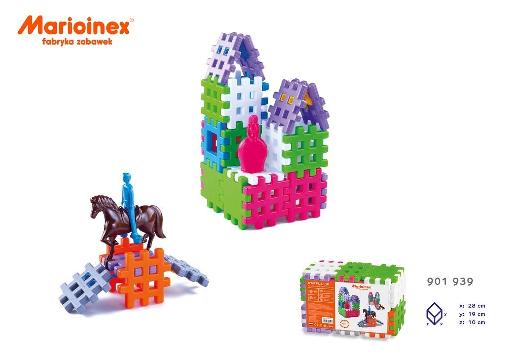 Opis produktuZasady bezpieczeństwaKLOCKI KONSTRUKCYJNE WAFLE (znane w przedszkolach m.in. jako: klocki waflowe, wafle, gofry) klocki pasujące do klocków przestrzennych wafli GRATIS 2 łączniki do klocków! Zawartość opakowania: 38 elementów: 33 klocków podstawowych (w siedmiu kolorach) 1 koń 1 księżniczka 1 jeździec + 2 łączniki GRATIS Opakowanie: folia. Klocki pozwalają na układanie wyjątkowych, przestrzennych konstrukcji. Dziecko poprzez zabawę ćwiczy zdolności manualne,pamięć oraz wyobraźnię. Zestaw występuje w różnej konfiguracji kolorów. Ten zestaw klocków konstrukcyjnych został opracowany z myślą o inspirowaniu wyobraźni małych budowniczych i zachęcaniu ich do nieograniczonej zabawy w budowanie. Prosta konstrukcja i łatwość łączenia oferują nieskończenie wiele możliwości kreatywnego konstruowania przestrzennych budowli. Klocki są tak pomyślane, by można było łączyć je w całość z innymi zestawami lub rozbudowywać i uzupełniać już posiadane. Twoje dziecko może - pobudzając wyobraźnię - zbudować co tylko zechce i stworzyć swój własny piękny świat. Funkcje klocków: - uczą kojarzenia kształtów i kolorów (dziecko poznaje pierwsze figury geometryczne, barwy, przedmioty) - rozwijają logiczne myślenie - doskonalą ruchy precyzyjne i postrzeganie przestrzenne dziecka - rozwijają sprawność manualną małych rączek - dopasowywanie klocków do siebie oraz próby piętrzenia ich w budowle ćwiczą koordynację wzrokowo-ruchową - ciekawa i bogata kolorystyka rozwija percepcję wzrokową Wymiary: pojedynczego klocka: ok. 10,5 x 10,5 cm opakowania: ok. 28 x 19 x 10,5 cm Wiek: 2+ x