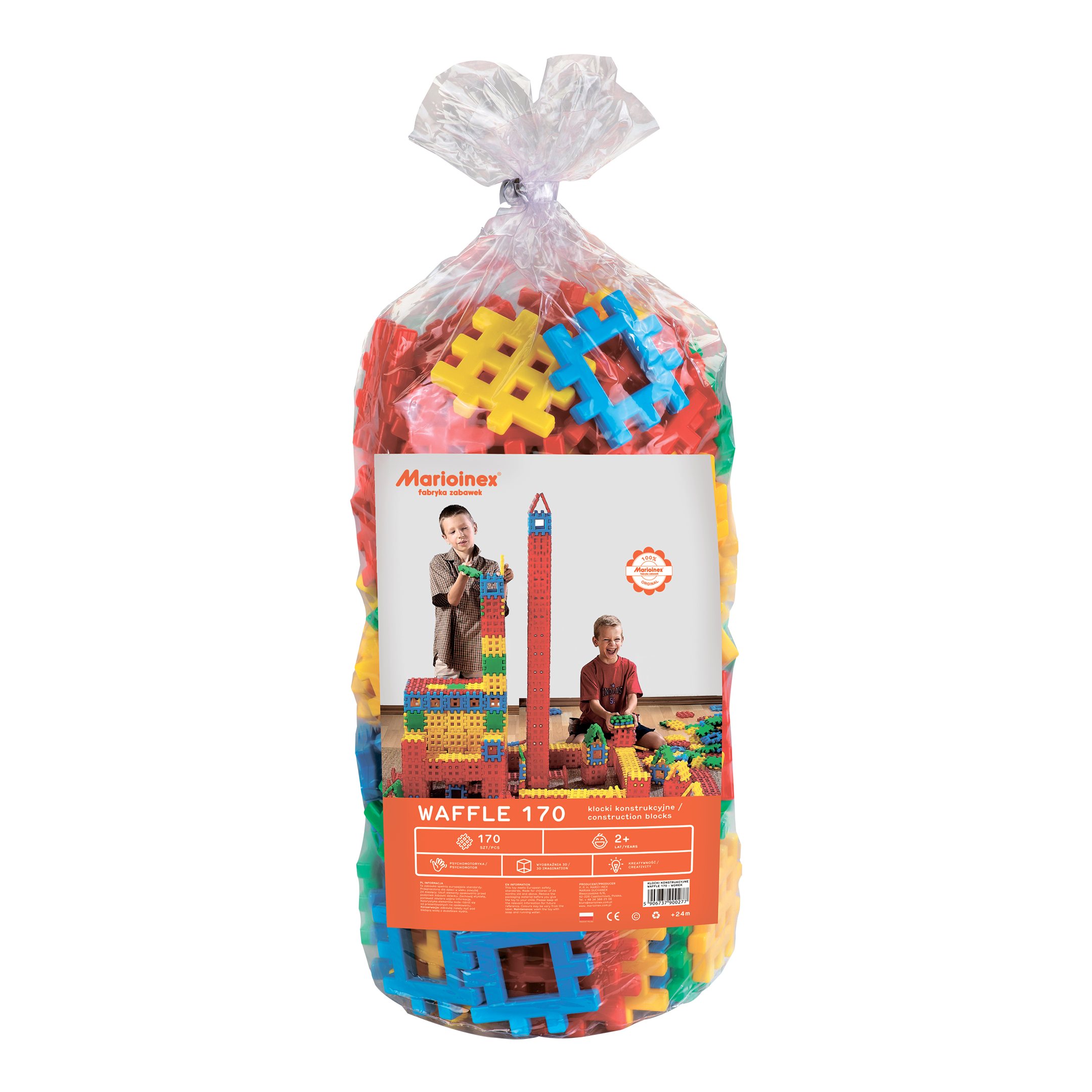 Opis produktuZasady bezpieczeństwaWaffle 170. Co może być w worku? No co, kot? Nie-e. Jeszcze raz, pomyślmy A może tak 170 klocków z serii Waffle, z których ułożysz sobie, co tylko zechcesz? Zamek? Jest! Rakieta? Proszę bardzo! Coś-na-kształt-czegoś-co-nie-przypomina-niczego-znajomego? Oczywiście, że tak! Ty tu budujesz, ty tu urządzasz i w ogóle jesteś królem albo królową klocków. Tylko najpierw trzeba je mieć! Marioinex bezpieczne klocki dla dzieci Klocki Marioinex są zaprojektowane tak, aby były jak najbardziej przyjazne i bezpieczne dla dzieci. Są wykonane z elastycznego, miękkiego i przyjemnego w dotyku materiału. Ich kształt został idealnie dopasowany do kształtu i wielkości dziecięcych dłoni, a zastosowane barwy są łagodne i przyjemne dla oka. Uzyskały nagrody w takich konkursach jak Zabawka Roku czy Świat Przyjazny Dziecku. Ta zabawka spełnia europejskie standardy. Przeznaczona dla dzieci w wieku powyżej 24 miesięcy. Usuń elementy opakowania przed podaniem zabawki dziecku. Zachowaj etykietę, ponieważ zawiera ważne informacje. Kolorystyka elementów może różnić się od prezentowanych na opakowaniu. Konserwacja: zabawkę należy myć pod bieżącą wodą z dodatkiem mydła. W zestawie znajdziesz 170 elementów. Rozmiar opakowania: 29 cm x 65 cm x 29 cm x