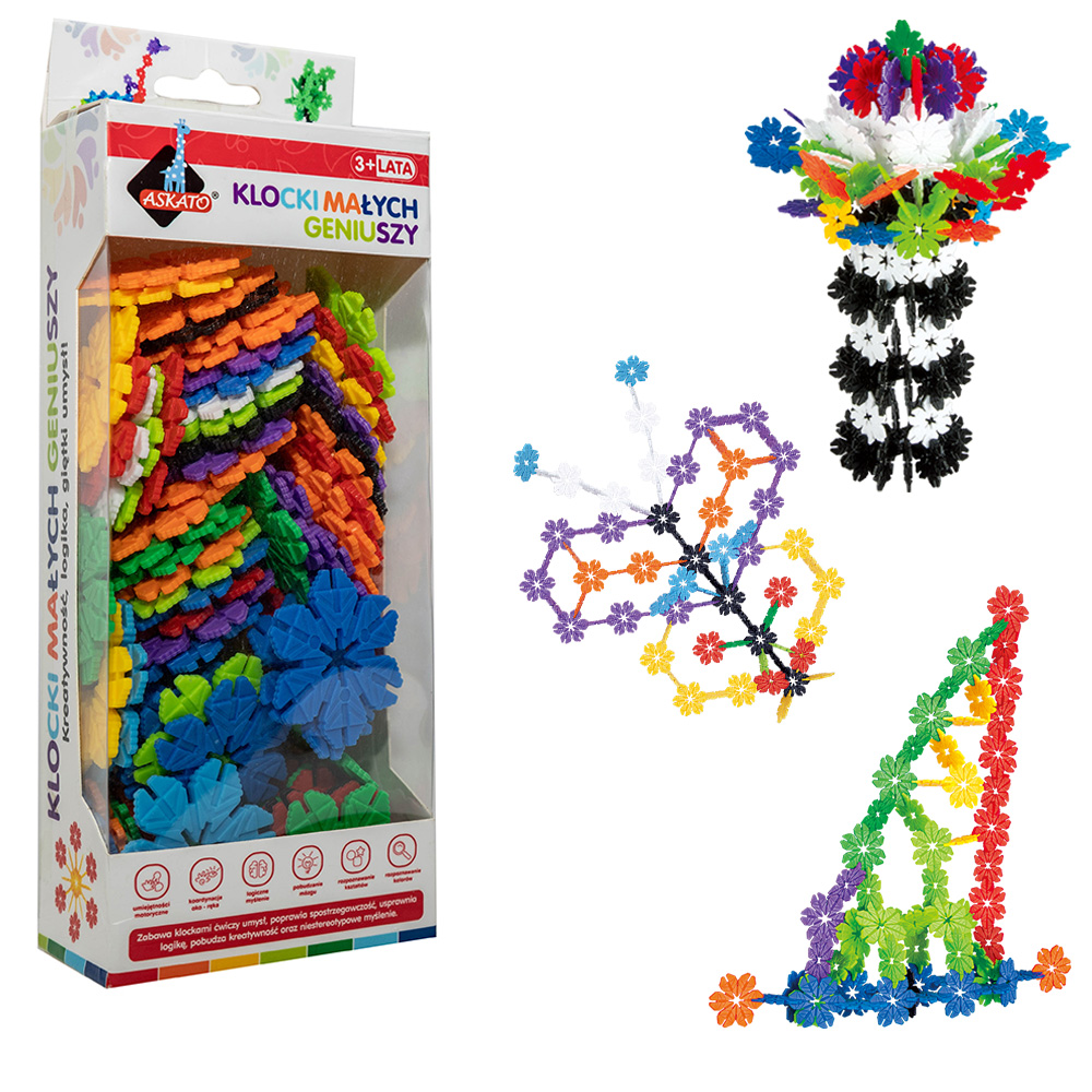 Aż 90 elementów w 10 kolorach pozwala stworzyć fantastyczne figury, zaczynając od tych prostych takich jak gwiazdka, literki i cyferki poprzez nieco trudniejszą żaglówkę, wiatrak czy samolot.