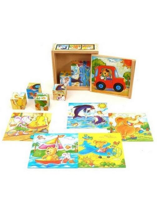 Klocki obrazkowe, 9 sztuk w drewnianym kuferku.