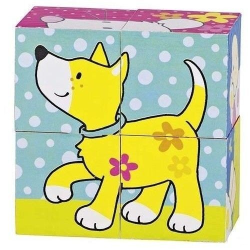 Klocki drewniane z kolekcji Susibelle w kartonowym opakowaniu. Z klocków można ułożyć 6 obrazków przedstawiających łosia, kucyka, owcę, ślimaka myszkę i pieska.