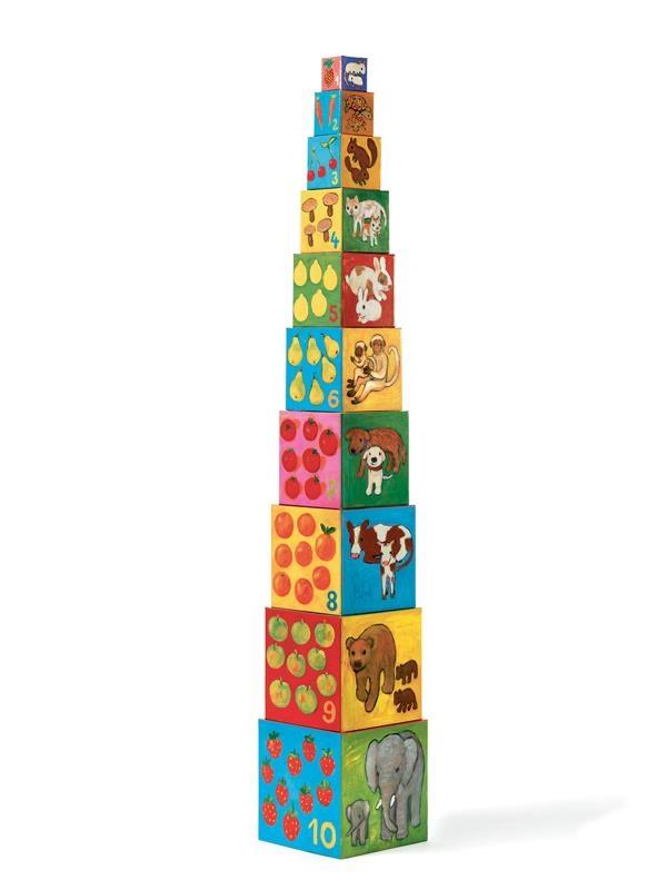 Klocki z firmy Djeco .Niesamowita zabawka dla małych i dużych...10 pudełek z grubego kartonu ustawiamy w wieżę i zaczynamy...Na jednej ścianie pojawią się wesołe zwierzaczki , na drugiej widzimy ukryte liczby- oglądamy , opowiadamy i pomagamy w nauce liczenia. Wieżę można oczywiście burzyć i chować pudełeczka jedno w drugie.wykonane z grubego kartonu przeżyją nie jedno burzenie.+12mwymiary 15x15x15cm