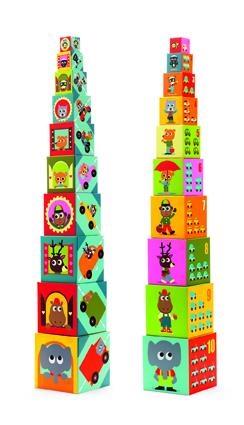 Klocki z firmy Djeco .Niesamowita zabawka dla małych i dużych... 10 pudełek z grubego kartonu ustawiamy w wieżę i zaczynamy...Na jednej ścianie pojawią się wesołe zwierzaczki , na drugiej widzimy ukryte liczby- oglądamy , opowiadamy i pomagamy w nauce liczenia. Wieżę można oczywiście burzyć i chować pudełeczka jedno w drugie.Wykonane z grubego kartonu przeżyją nie jedno burzenie.Wiek: 12m+Materiał: gruba, wytrzymała i lakierowana tekturaWysokość wieży: 87 cmWymiary pudełka: 15 x 15 x 15 cm