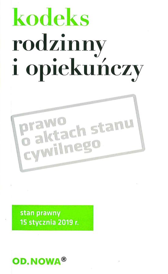 „Kodeks rodzinny i opiekuńczy” broszura – zawiera jednolity tekst ustawy z dnia 25 lutego 1964 r. Kodeks rodzinny i opiekuńczy, przepisy wprowadzające kodeks rodzinny i opiekuńczy, ustawę z dnia 28 listopada 2014 r. Prawo o aktach stanu cywilnego oraz skorowidz przedmiotowy KRO. Poprzez system przypisów publikacja umożliwia studentom i praktykom łatwe śledzenie zmian prawnych. Zaletą książki jest jej praktyczny, poręczny format, przejrzysty układ graficzny i niska cena. Łatwą orientację w materiale umożliwia obszerny skorowidz. Stan prawny: styczeń 2019 r. Przepisy wchodzące w życie później niż podany stan prawny aktu prawnego ale już ogłoszone w Dzienniku Ustaw podajemy w ramkach z zachowaniem przepisu w dotychczas obowiązującym brzmieniu.