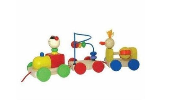 Drewniana zabawka traktor z przyczepką do ciągnięcia, po naciśnięciu główki wydaje dźwięki.