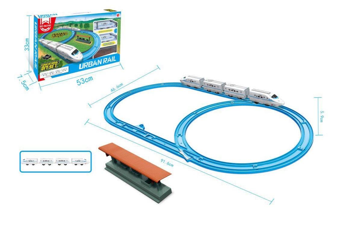 Opis produktuZasady bezpieczeństwaZabawkowa kolejka cztero wagonowa. Tory po rozłożeniu - 91.6x46.6 cm x