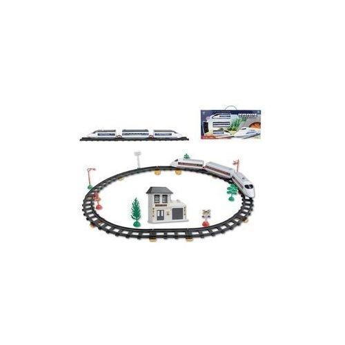 Plastikowa kolejka na baterie. Zestaw zawiera kolejkę, tory o łącznej długości 20 cm i akcesoria - stację, drzewa, znaki.