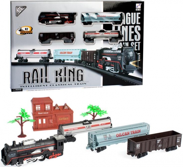 Zestaw zawiera lokomotywę wagoniki oraz tory. Zabawka ze swiatłem i dźwiękiem.