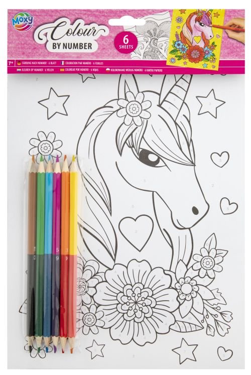 Kolorowanie według numerów. Format A4, w zestawie 6 arkuszy i 6 kredek. Dostępne 3 warianty: Mandala, Jednorożec, Zwierzęta.