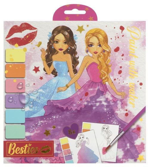 Wodna kolorowanka o wymiarach 20 x 20 cm. W książeczce znajduje się 8 arkuszy kartek do pomalowania wodą i pędzelek. Ilustracje przedstawiają księżniczki w pięknych sukniach.