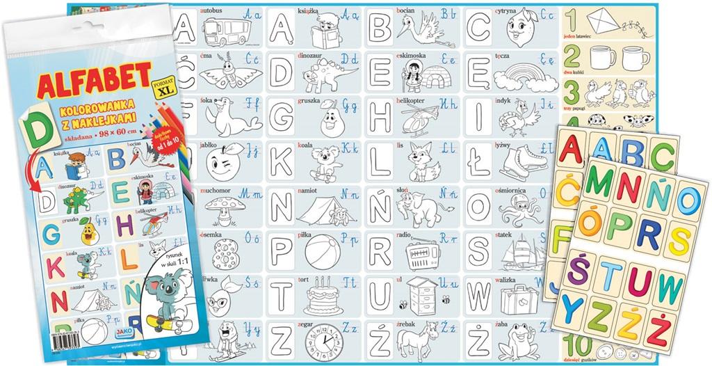 Opis produktuZasady bezpieczeństwaDzięki składanej kolorowance "Alfabet" dzieci mogą zapoznać się z literami polskiego alfabetu oraz nauczyć się poprawnej kolejności alfabetycznej. Zestaw składa się z arkusza XL oraz 32 naklejek z drukowanymi, wielkimi literami. Naklejki można wkleić w wyznaczonych miejscach, obok obrazków do pokolorowania, których nazwy zaczynają się na daną literę (np. A jak autobus) lub ją zawierają (np. Ę w słowie gęś). Obok obrazków umieszczono także wielkie i małe litery pisane. Poza alfabetem kolorowanka zawiera liczby od 1 do 10 i przypisane do nich w odpowiednich ilościach przedmioty. Kredki w dłoń! Ogromny, ilustrowany arkusz o wymiarach 98 x 60 cm jest do dyspozycji małego artysty. Pokolorowany i uzupełniony naklejkami świetnie się sprawdzi jako edukacyjny plakat na ścianę. Kolorowanie zapewnia doskonałą rozrywkę, a przy tym rozwija zdolności manualne, staranność oraz koordynację wzrokowo-ruchową. To znakomite przygotowanie do szkoły, a także możliwość wyciszenia. x