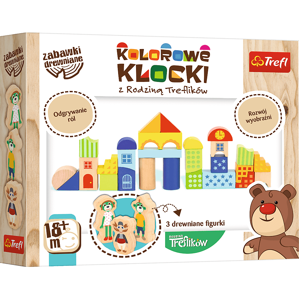 Zestaw kolorowych klocków o różnych kształtach i wymiarach z 3 postaciami z Rodziny Treflików. Wykonany z naturalnego drewna jest doskonałą zabawką ogólnorozwojową, która zachęca do wspólnej zabawy. Wszystkie materiały wykorzystane do stworzenia zabawki posiadają atesty, a także zostały pomalowane nietoksycznymi farbami.
