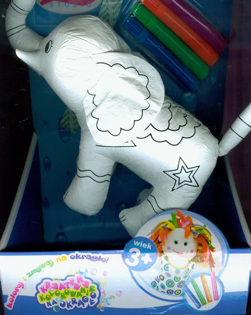 W skład tego zestawu wchodzi słonik-maskotka i 4 zmywalne flamastry. Tułów, uszy, trąba i ogon słonika ozdobione są różnymi wzorami: prążkami, gwiazdkami, kwiatkami.