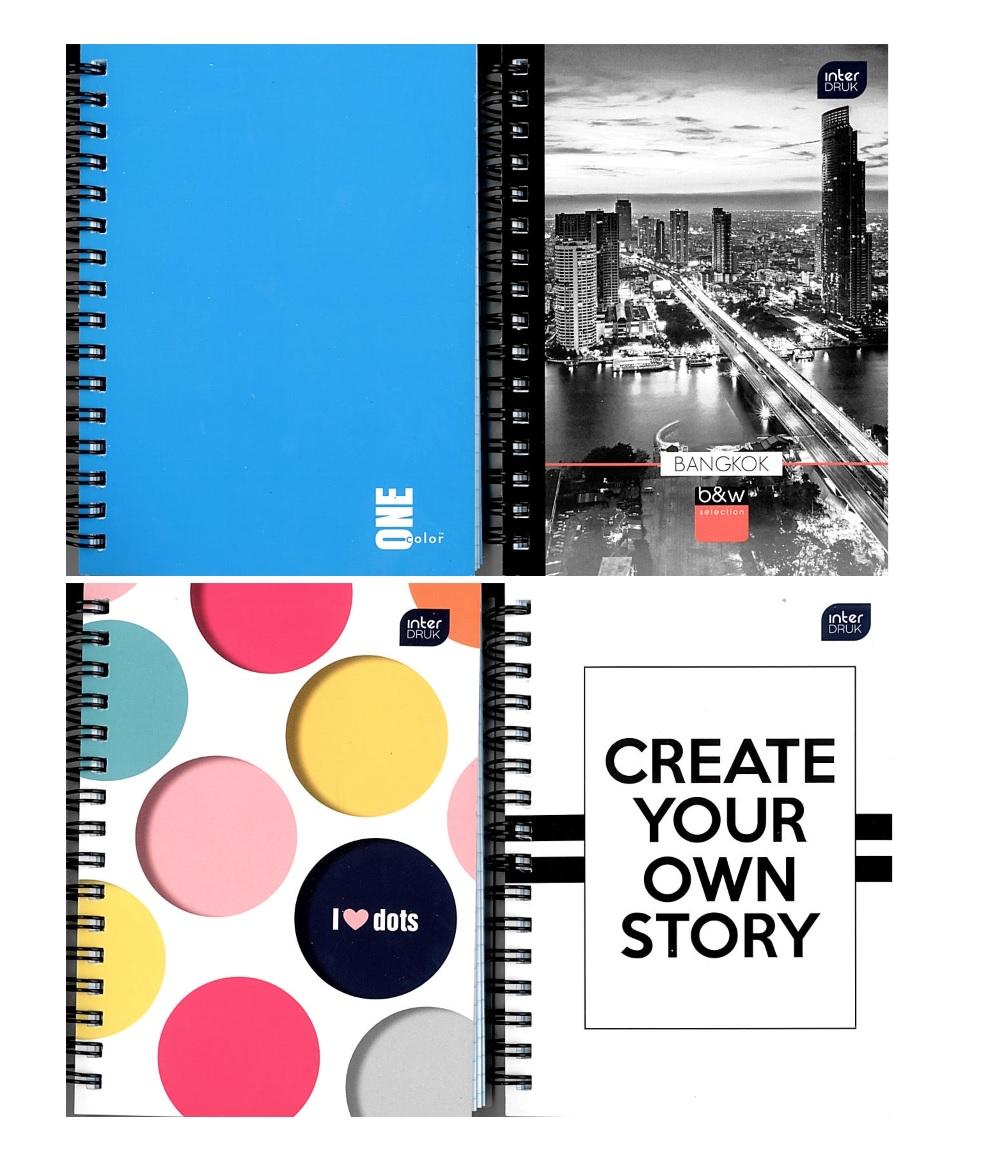 Kołozeszyt A6, 120 kartek w kratkę, mix wzorów. 5 sztuk w opakowaniu zbiorczym. Producent Interdruk.
