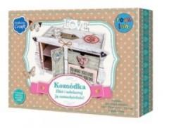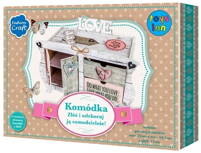 Zestaw do złożenia i udekorowania komódki zawiera: elementy z płyty MDF gotowe do złożenia, papier ozdobny - 6 arkuszy, arkusz papieru A5 z dekoracjami, 2 kartonowe szuflady do złożenia, koronkę, perełki - 15 szt., taśmę piankową, klej oraz instrukcję.