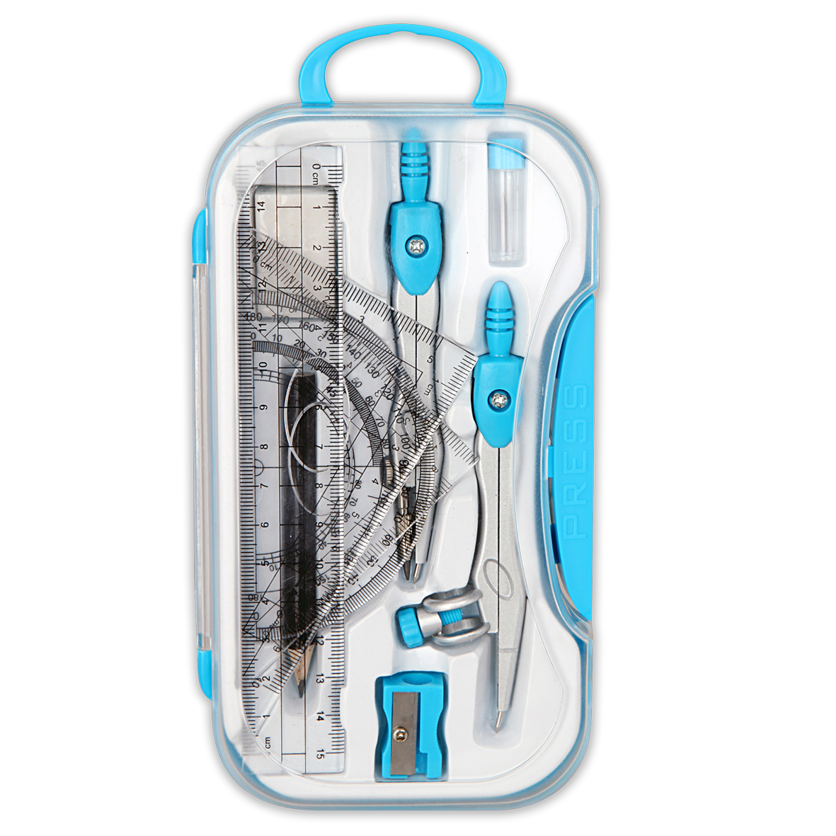 Opis produktuZasady bezpieczeństwaZestaw składający się z dwóch cyrkli: metalowego z grafitem 2 mm oraz z ołówkiem, kompletu geometrycznego, temprówki i pojemnika na zapasowe grafity. Całość w kolorowym etui z zawieszką. x